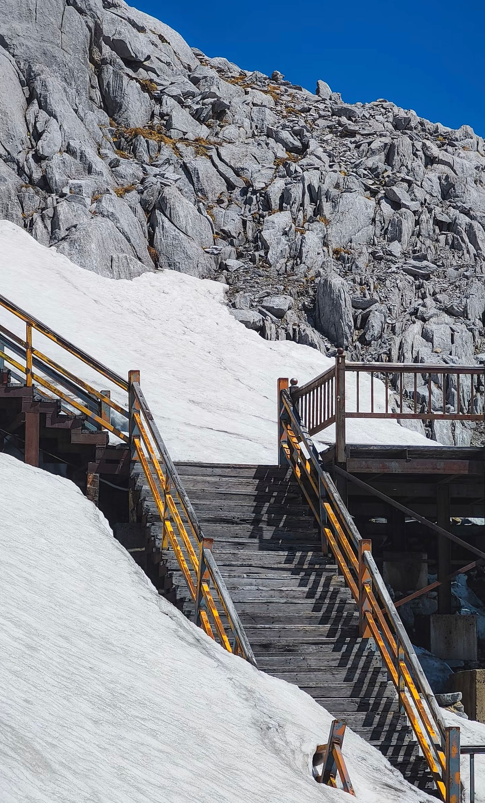 Stepping out of the cable car, the air hits you—crisp, thin, and biting cold. But the journey isn't over. To reach the highest accessible point, you must climb a series of wooden stairs that wind up the mountain.